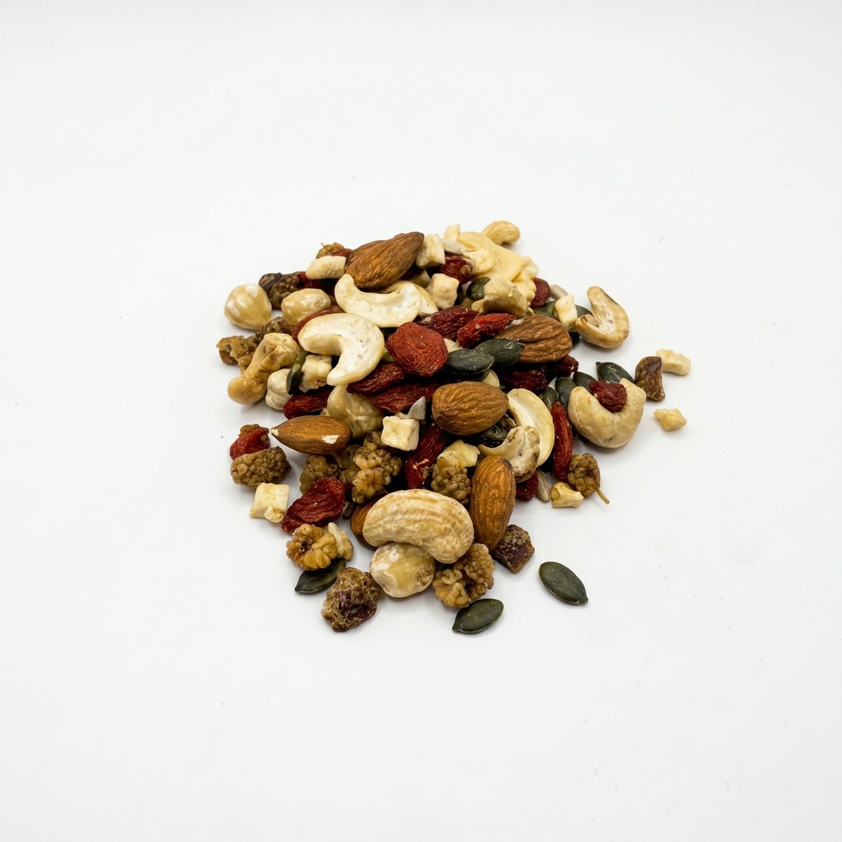 Cashewnoten (NOTEN), hazelnoten (NOTEN), amandelen bruin (NOTEN), zonnebloempitten, pompoenpitten, gojibessen, dadelblokjes, moerbeien, appelblokjes.Voedingswaarden (per 100 gram)| Energie | 2100 kJ / 500 kcal |
