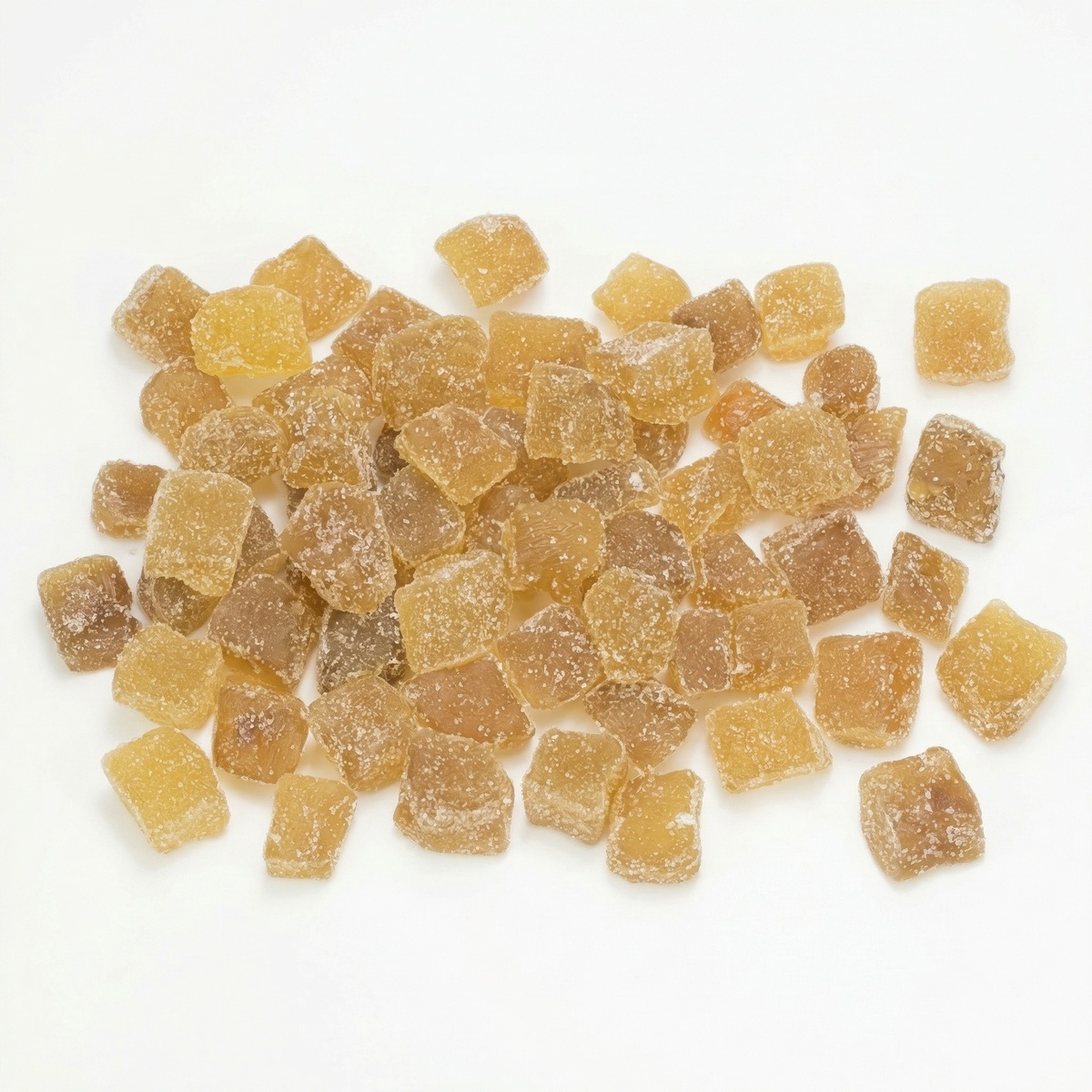 Zachte blokjes gesuikerde gember met een uitgesproken kruidige en licht pittige smaak. Zoet en verwarmend tegelijk, heerlijk als snack, bij de thee of als smaakmaker in desserts en baksels.