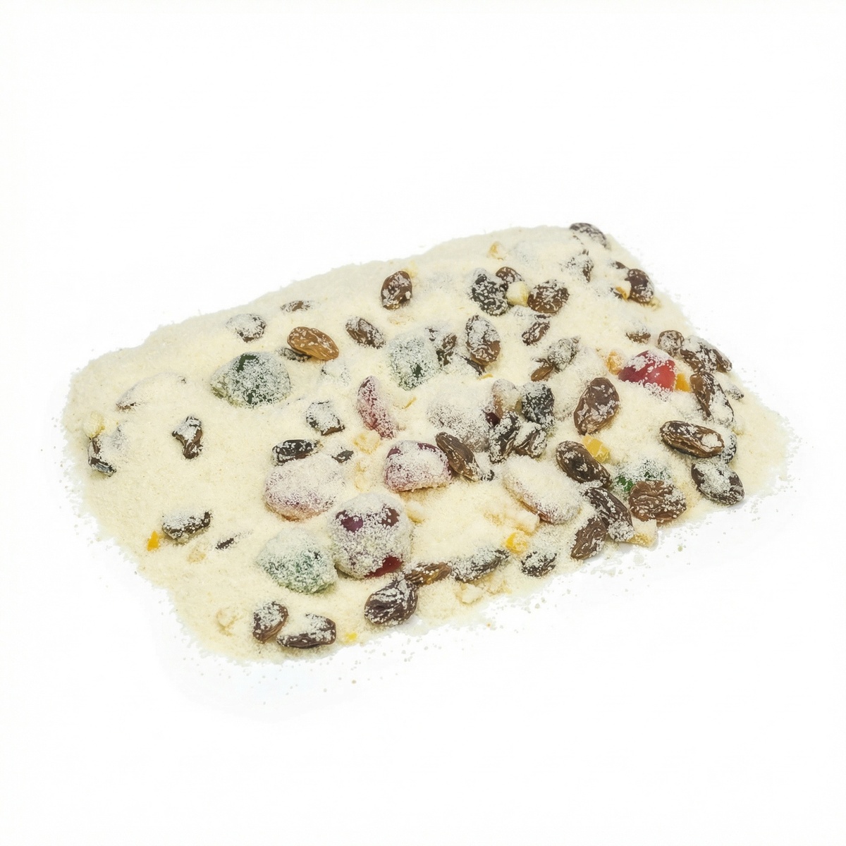 Tarwegriesmeel (GLUTEN), suiker, rozijnen, kersen (kersen, glucose-fructosestroop, suiker, zuurteregelaar (E330), conserveermiddelen (E202, E220 – SULFIET), kleurstoffen (E120, E133, E150a)), sinaasappel (sinaasappel, glucose-fructosestroop, suiker, zuurteregelaar (E330)), katoenzaadolie, citroen (suiker, citroen, gemodificeerd aardappelzetmeel), aroma.Voedingswaarden (per 100 gram)| Energie | 1499 kJ / 354 kcal |