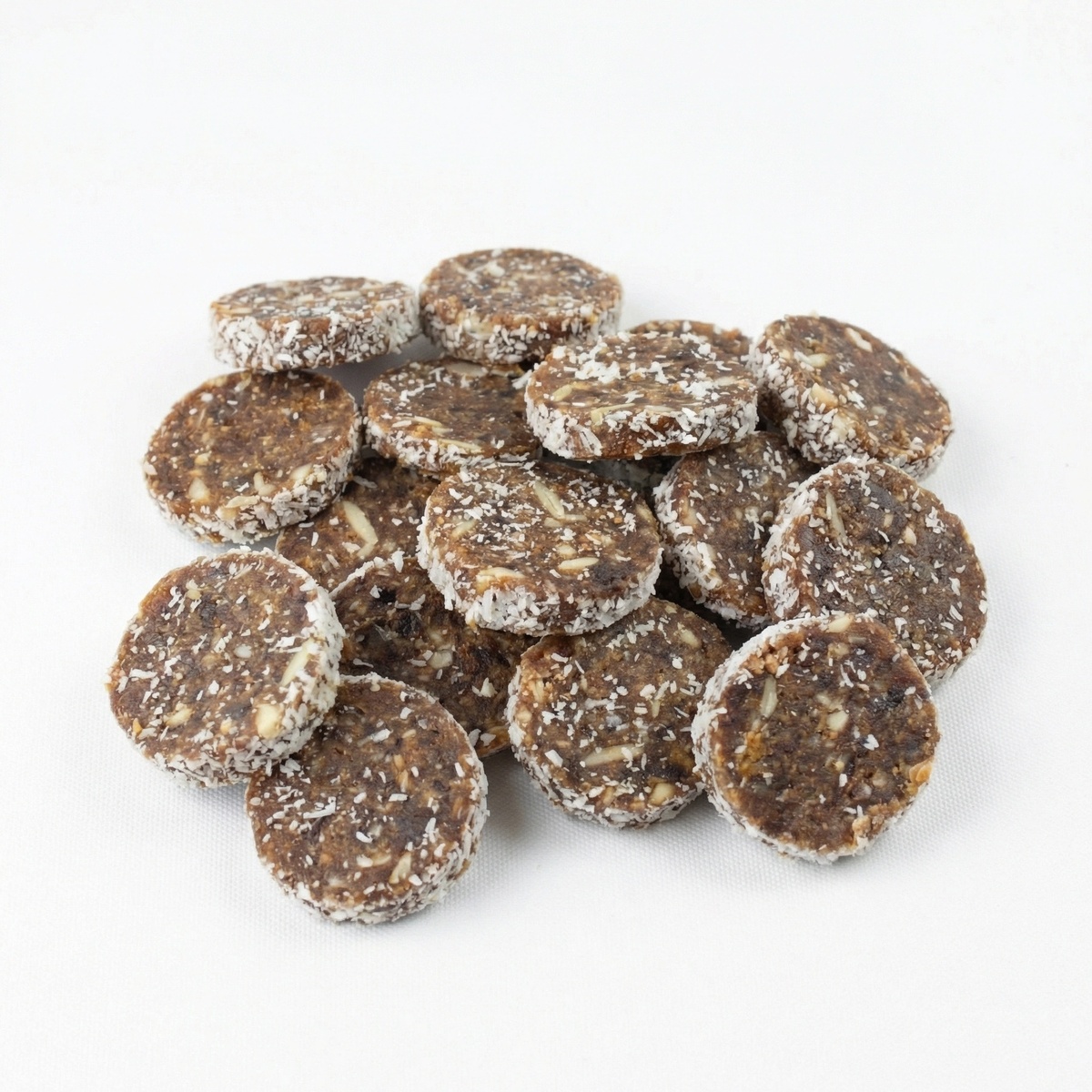 Natuurlijke en voedzame snack op basis van dadels, noten en zaden. Zacht en licht chewy van structuur met een volle nootachtige smaak en een subtiele kokosnoot. Zonder toegevoegde suikers, ideaal als verantwoorde snack of energieboost tussendoor.