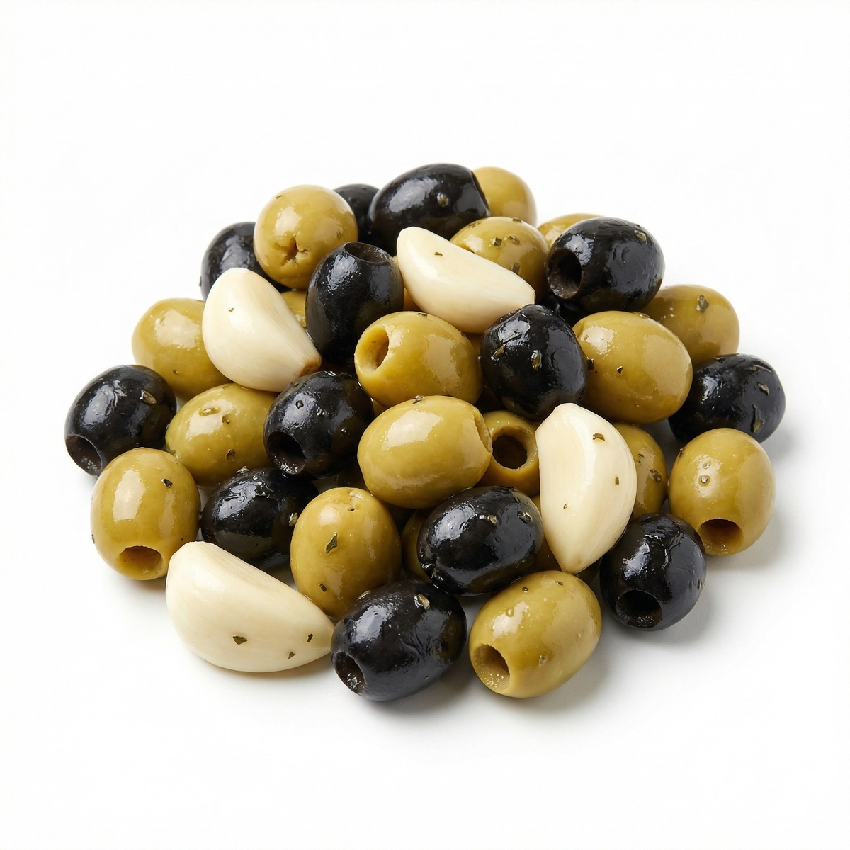 Een smaakvolle mix van groene en zwarte olijven, gemarineerd met knoflook. Vol en hartig van smaak met een subtiele knoflooktoon. Ideaal als borrelhapje, bij tapas, salades of als mediterrane smaakmaker in uiteenlopende gerechten.
