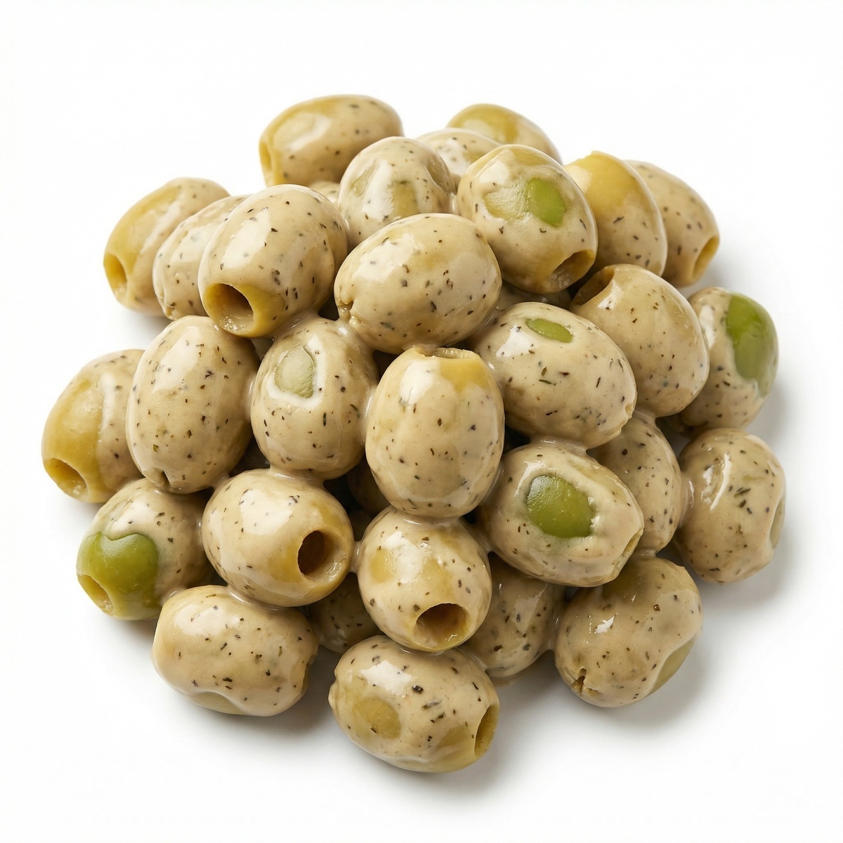 Groene olijven omhuld met een romige honing-mosterdpasta. De combinatie van zachte zoetheid van honing en de milde scherpte van mosterd zorgt voor een uitgebalanceerde, volle smaak. Een onderscheidende borrelolijf die perfect past bij tapas, borrelplanken en koude gerechten.