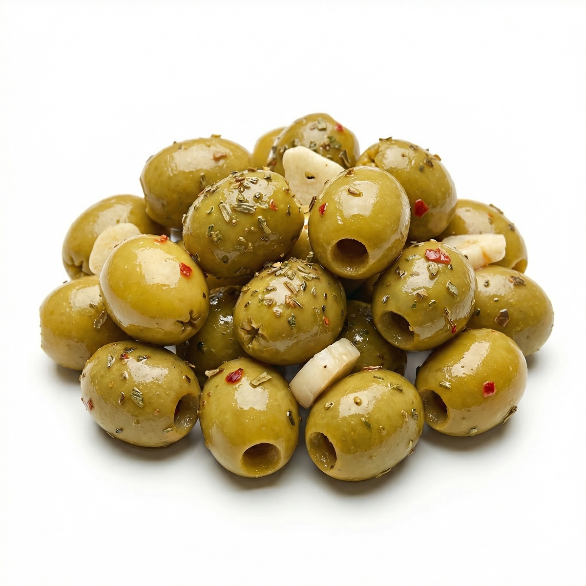 Grote olijven met een stevige bite, gemarineerd met knoflook in raapzaadolie. Rijk en aromatisch van smaak, waarbij de knoflook mooi in balans is met de volle olijfsmaak. Perfect als premium borrelolijf of op een mediterrane borrelplank.