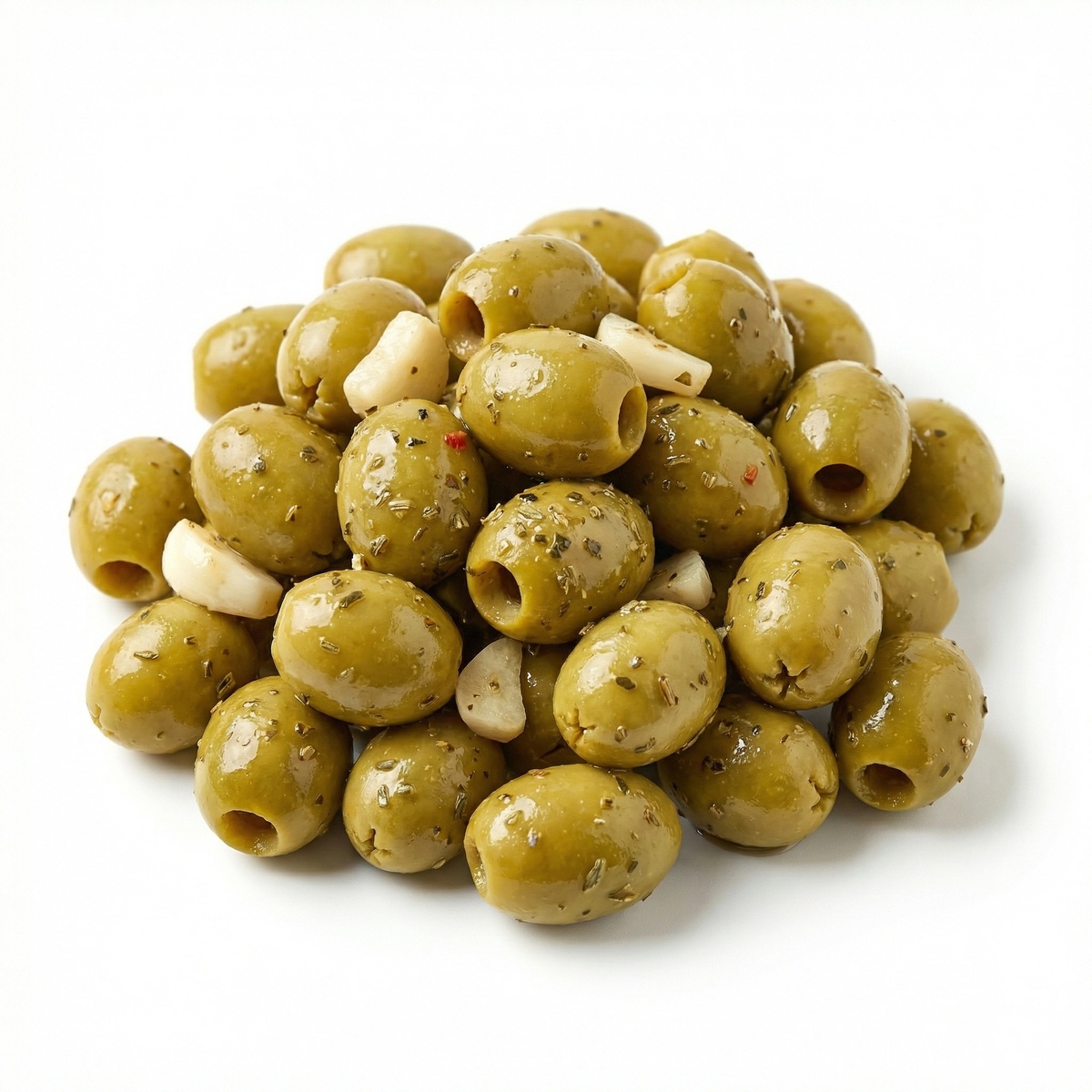Kleine olijven met een bite, gemarineerd met knoflook in raapzaadolie. Vol van smaak met een duidelijke, maar toegankelijke knoflooktoon. Door het kleinere formaat ideaal als borrelhapje of als onderdeel van tapas en salades.