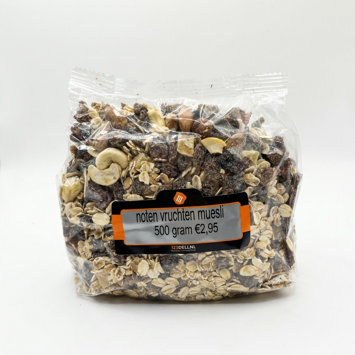 Rijkgevulde muesli met granenvlokken, rozijnen, noten en stukjes fruit. Een vezelrijk ontbijt met een zachte zoete smaak en knapperige bite van noten.