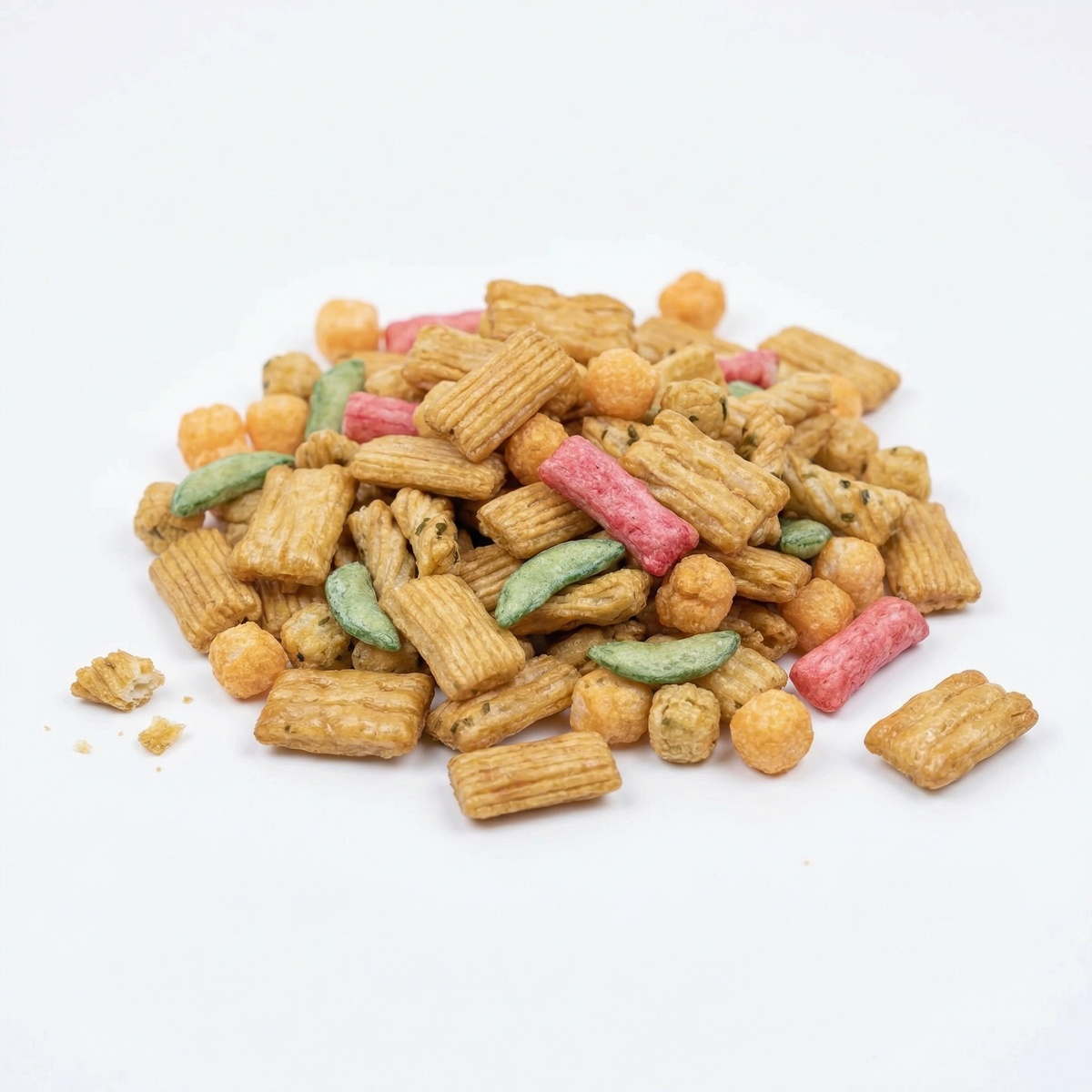 Knapperige mix van rijstcrackers met een hartige sojasaussmaak. Gevarieerd in vorm en kleur met een bros mondgevoel en licht zoete umami-smaak. Ideaal als borrelsnack of onderdeel van een Aziatisch snackassortiment.